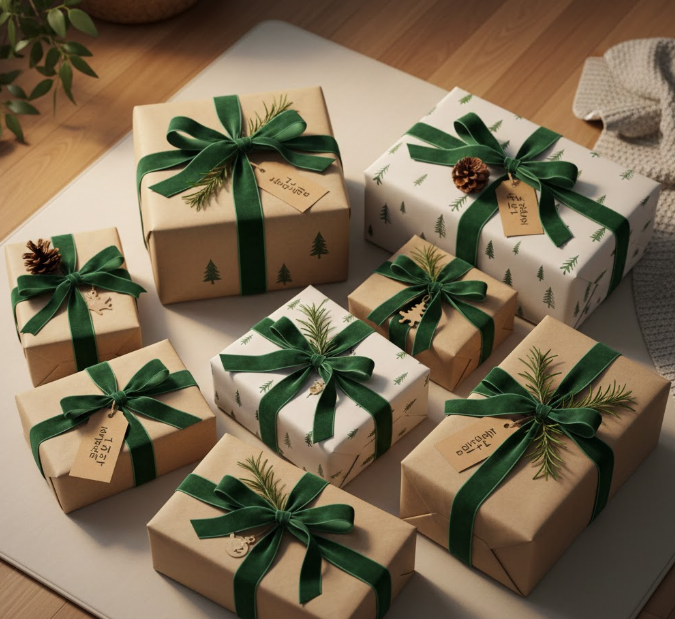 A. 기본 크라프트지에 그린 리본만 묶어도 ‘그린 포레스트’ 감성으로 충분히 예뻐요. 작은 카드에 한 줄 메시지를 적어 붙이면 완성도 업!