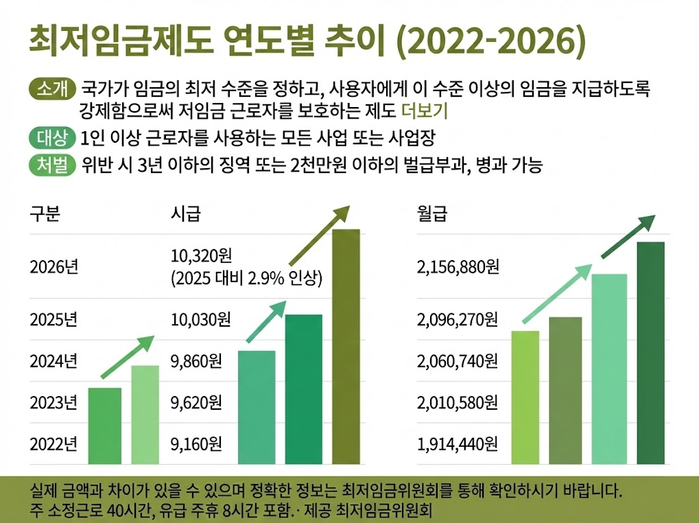 • ✔ 2024년 9,860원 → 2025년 10,030원 → 2026년 10,320원으로 3년 연속 인상되었습니다.